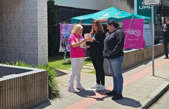 O time cor-de-rosa da Rede Feminina de Combate ao Câncer de Criciúma (RFCC) e a equipe da URC Diagnósticos uniram forças, na manhã desta segunda-feira (20) para uma mobilização alusiva ao Outubro Rosa nas ruas em torno da clínica, no Centro de Criciúma. A ação ocorreu em cinco pontos, onde 11 volutárias da rede e 20 profissionais abordaram pedestres, distribuíram panfletos e conversaram sobre a importância da prevenção e do diagnóstico precoce do câncer de mama.