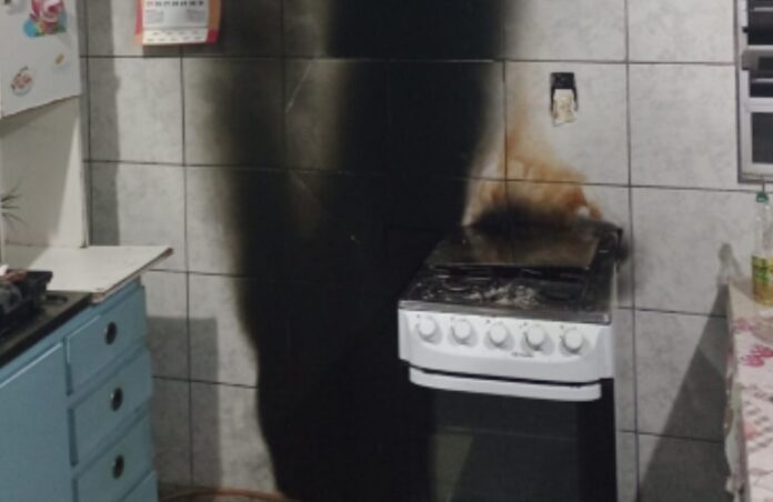A chama intensa gerada pelo botijão provocou danos em estruturas próximas da cozinha, atingindo o fogão, parte da parede e também o forro de PVC do teto. Apesar do susto, o incêndio ficou restrito à área onde estava o equipamento.
