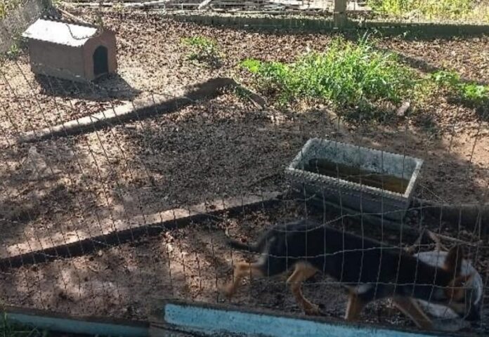 O animal adulto estava amarrado a uma estrutura de bambu, com corrente curta que limitava sua movimentação a cerca de 30 centímetros, apresentando magreza acentuada e costelas visíveis. Os filhotes permaneciam em um cercado improvisado, sem água limpa e sem ração, com sinais aparentes de desnutrição.
