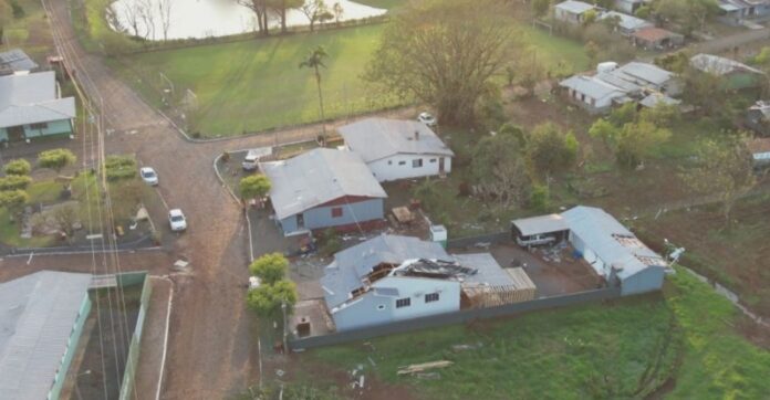 De acordo com relatos locais e imagens de drone fornecidas pela Coordenadoria Regional de São Miguel do Oeste, é possível observar um caminho de destruição com telhados parcialmente destruídos e árvores tombadas, características condizentes com a ocorrência de tornados.