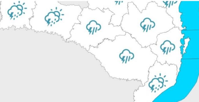 Durante à tarde, devido ao calor e à umidade, a instabilidade aumenta, trazendo temporais para todas as regiões. A Defesa Civil alerta para risco moderado a alto para destelhamentos, danos na rede elétrica, alagamentos e enxurradas pontuais. As máximas chegam perto dos 30ºC no Oeste, Planalto Norte e Vale do Itajaí. No litoral, as rajadas de vento podem oscilar entre 40 e 60 km/h.