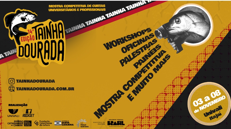 O 14º Festival de Cinema Tainha Dourada será realizado de 3 a 8 de novembro, com programação gratuita composta por oficinas, workshops, palestras, painéis, mostras e atrações culturais. As inscrições são gratuitas, mas devem ser feitas previamente pelo site www.tainhadourada.com.br. Para confirmar presença na solenidade de abertura do evento no período matutino, inscreva-se em https://forms.gle/qqN9Jnmq4GJHuijx8.