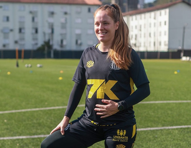 A atleta do Santos Ketlen Wiggers, de 33 anos, natural de Rio Fortuna, fez história ao se tornar a primeira jogadora do futebol brasileiro a manter os treinamentos até o oitavo mês de gestação.