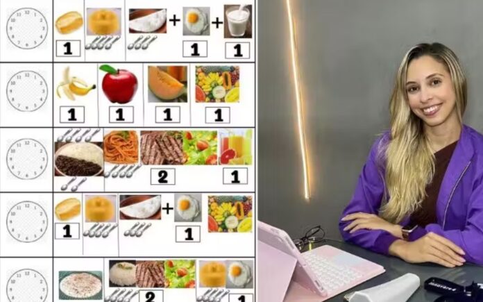 Da mesma forma que médicos já fizeram com receitas semelhantes sobre remédios, a nutricionista Linka Nascimento, que atua no Sistema Único de Saúde (SUS) de Fortaleza (CE), criou um plano alimentar todo ilustrado. Ele tem imagens dos alimentos, colheres e números, para indicar o que comer, quantas doses e quantas vezes ao dia.