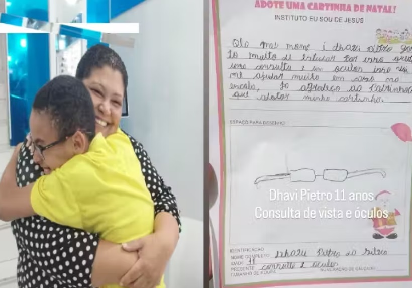 “Nós do Laboratório JBRAGA ficamos encantados com a cartinha de Natal do pequeno Dhavi Pietro! Seu pedido de natal tocou profundamente nossa equipe, pela simplicidade e o quanto necessário e urgente era, ele pediu óculos para poder continuar estudando, que é algo que ele tanto ama’, escreveu a empresa no Instagram.