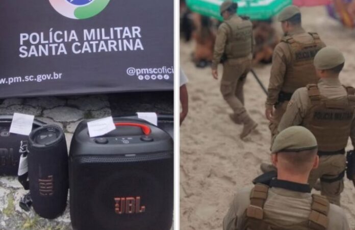Quatro caixas de som foram apreendidas pela Polícia Militar durante uma fiscalização realizada na tarde deste domingo (28) na Praia do Rosa Norte, em Imbituba.