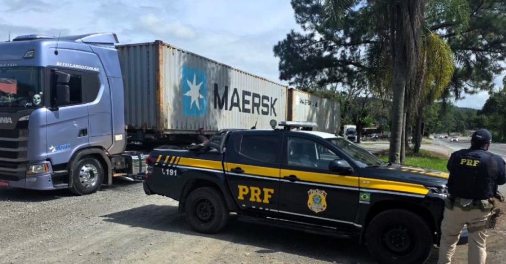 O veículo carregava tora de madeira serrada com destino ao porto de Itajaí. A fiscalização descobriu que uma peça do sistema de freios a ar estava isolada com cordas. O improviso estanca o vazamento de ar, mas anula o funcionamento dos freios naquele eixo.