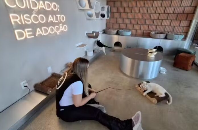Há também bebedouros com água corrente, uma sala exclusiva para filhotes e uma varanda protegida onde os gatos podem observar o movimento da rua.