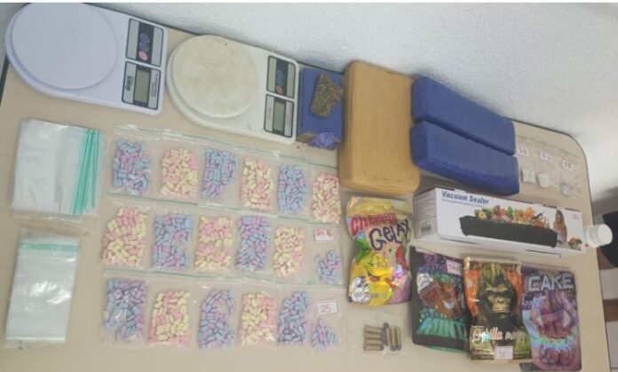 Durante a busca, os militares localizaram 836 comprimidos de ecstasy, cerca de 3,2 quilos de maconha e 18 gramas de haxixe, escondidos em um móvel e na geladeira.